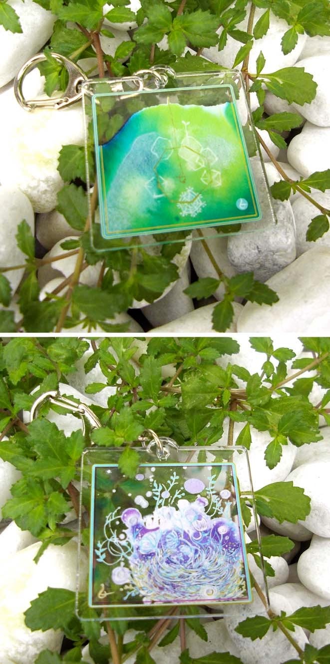 *白雲友子・画「籠芽(カゴメ・加護愛)」と「像神名(カタカムナ)」を四角いキーホルダーにデザインしました。