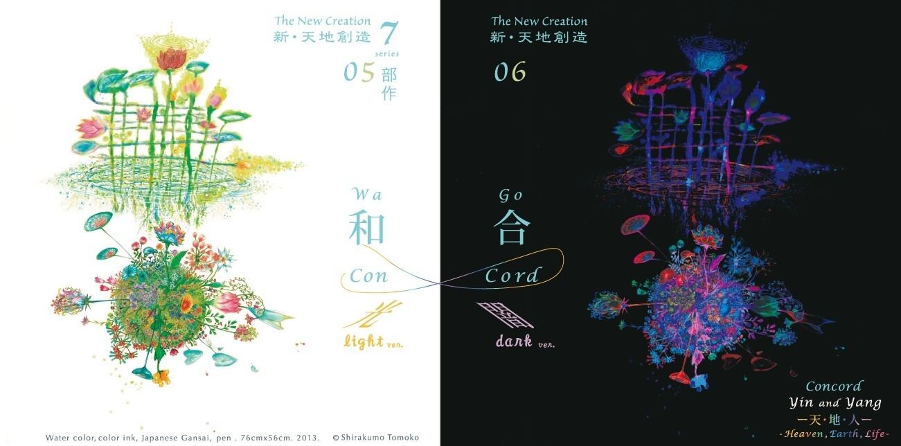 *白雲友子・画「新・天地創造7部作」「和合-天地人-光と闇(陰陽)」の絵を、対(つい・ペア)にした透明プラスチック製の栞です。光にかざすとステンドグラスのようで綺麗です。